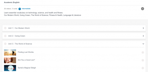 此外,亦有「Courses 影片主題學習」,讓學生跟著一個主題學習英文,例如: