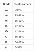 Intellispeech℠ computes a percentile relative to other learners to produce a video grade. For instance, if we determine that the speech for the video was 75% better than other learners, the learner would get a “B+” as a video grade.