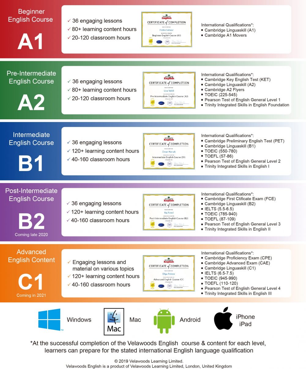 Velawoods English is the only English course designed with a highly interactive and immersive learning experience, using a syllabus aligned to internationally recognised English language qualifications and the Common European Framework of Reference for Languages (CEFR).